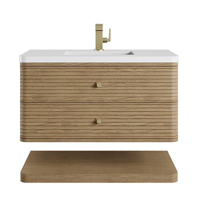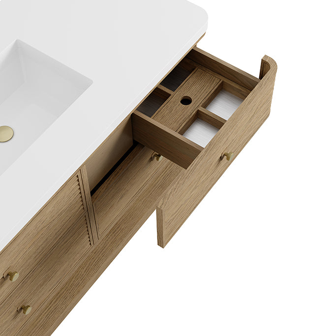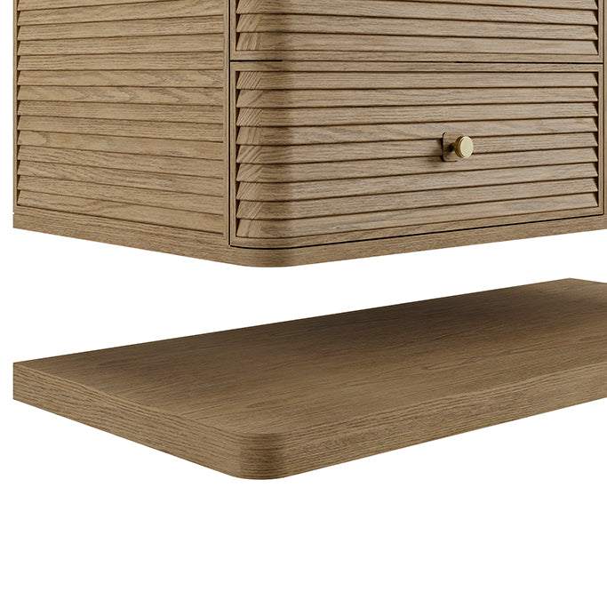 Distinguished by a louvered façade and gently curved profile, this collection pairs architectural precision with modern invention. The wood louvers are created using solid Ash wood with a rich wire-brushed texture. Sleek, beveled Brass knobs highlighted by wood back plates provide a graphic focal point and play against the vanity's curved wraparound edges.