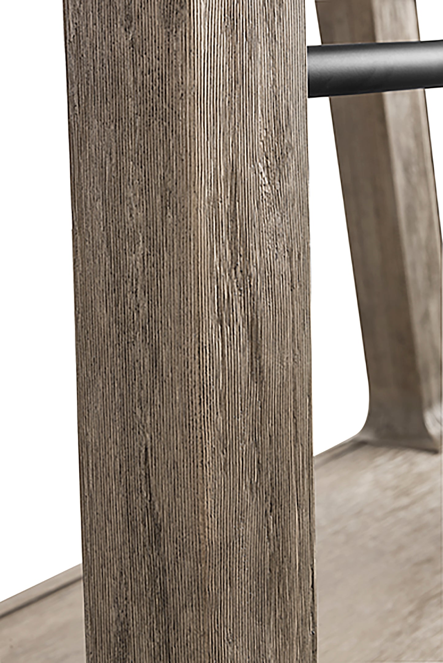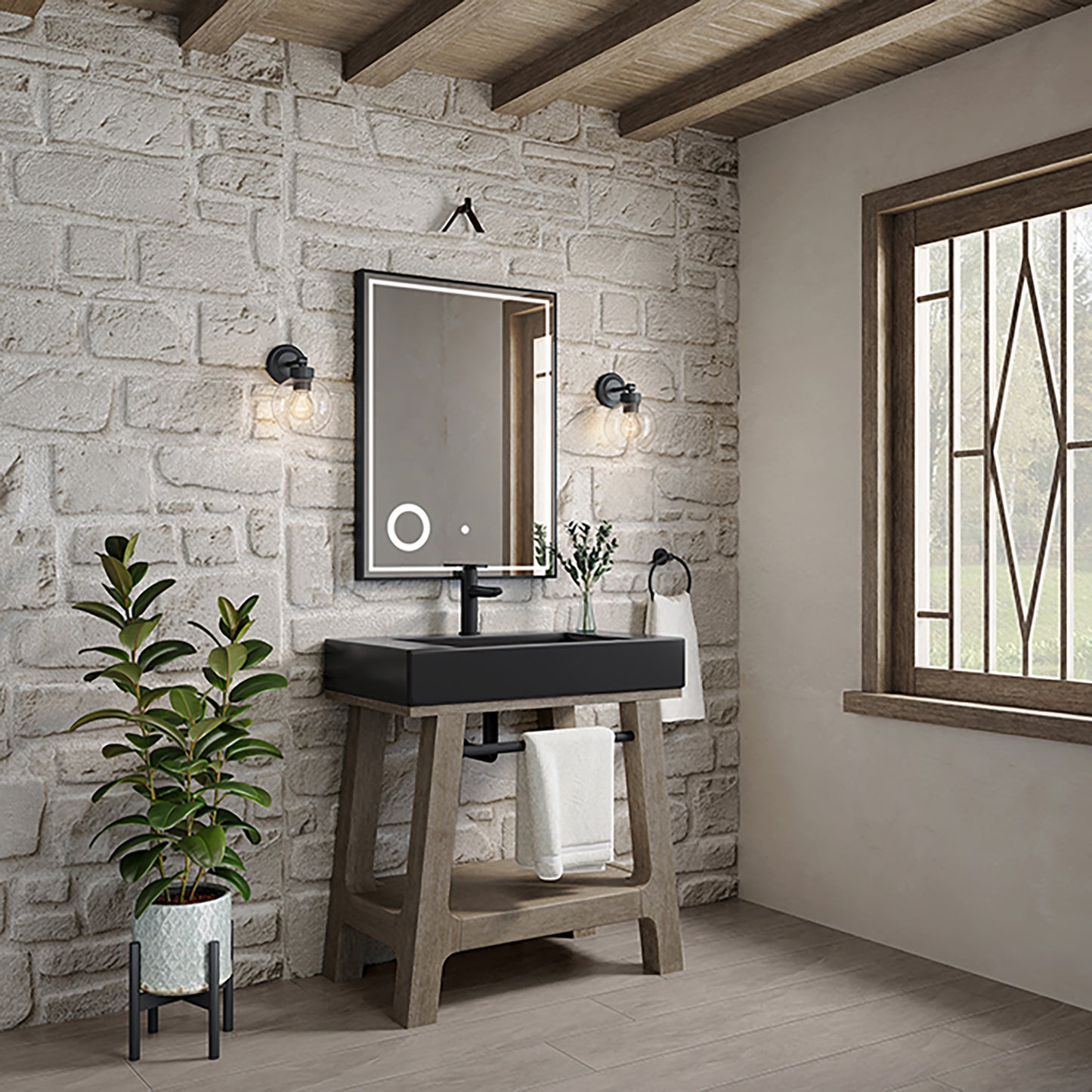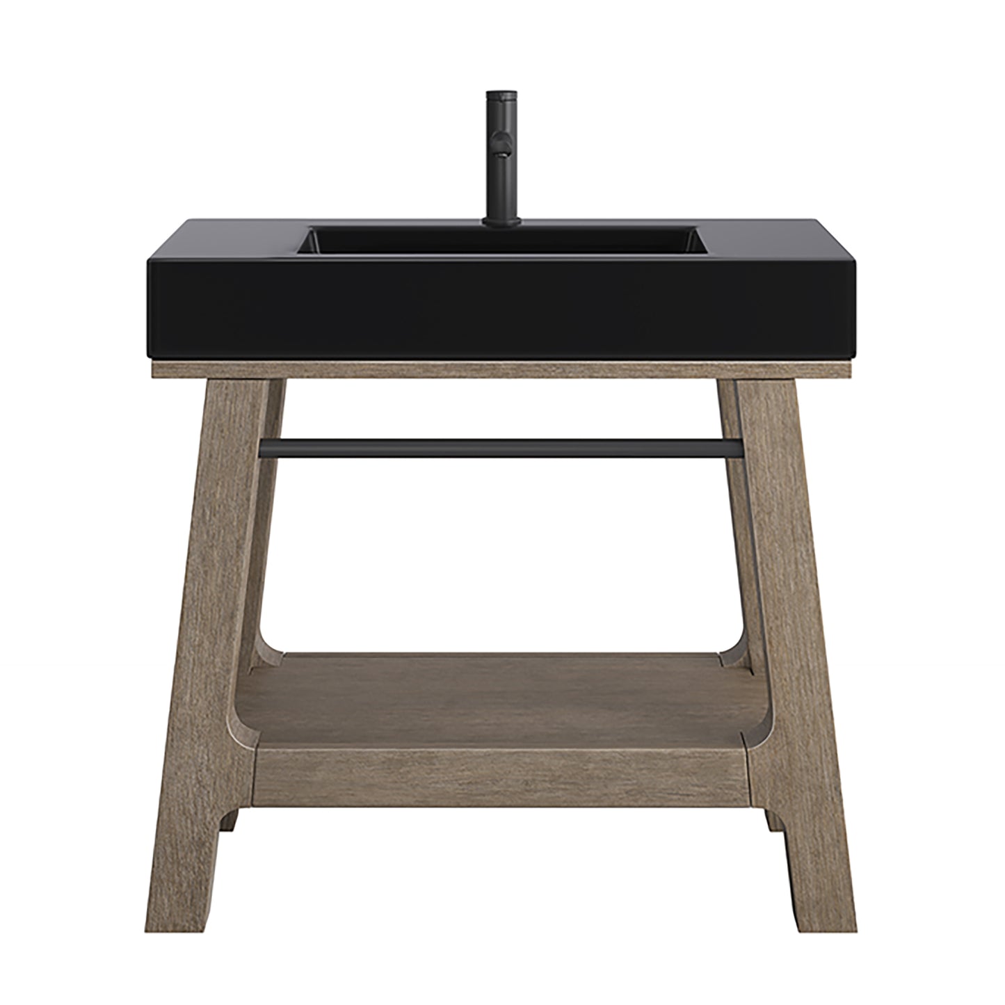 The Auburn Console Vanity features a modern shape that beautifully blends rugged and elegant details. The wire-brushed finish showcases natural texture and wood grains with subtle distressing. The smooth, high-profile integrated composite sink top, available in Glossy White or Matte Black, adds a modern element while the tapered frame and console shelf add visual interest.Â