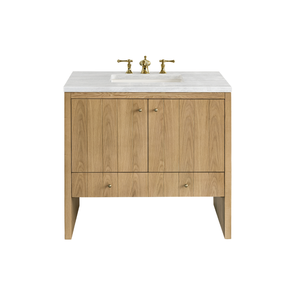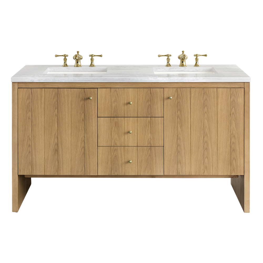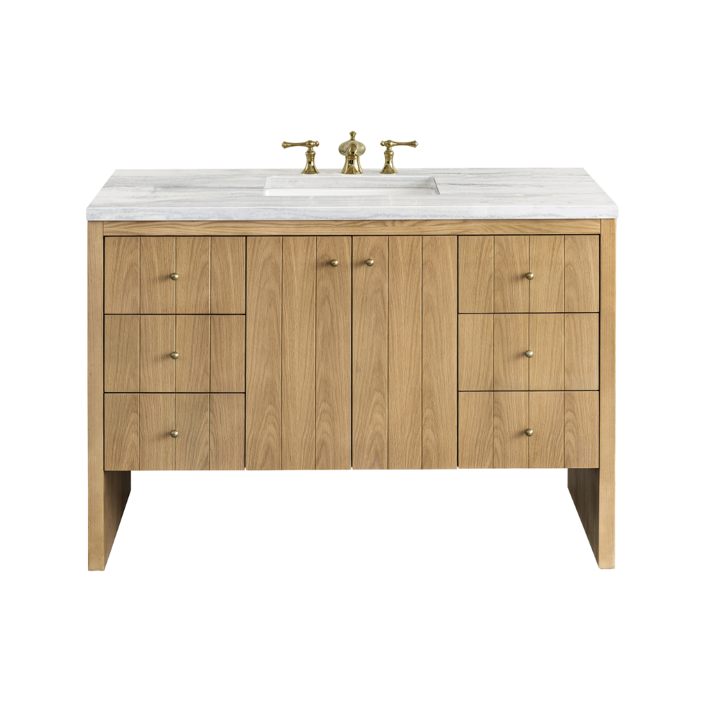 Featuring unique cathedral woodgrain, this minimalistic design is anything but plain and simple: with waterfall-inspired sides, paneled drawer and door fronts, Champagne Brass knobs, ample storage, and paneled detailing, the Hudson Collection seamlessly complements multiple design aesthetics while balancing practicality and chic detailing.