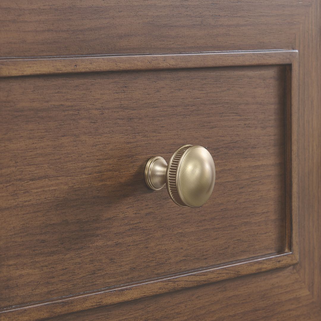 beautiful finishes, the Lorelai features reeded accents and clean, raised picture frame details. The subtle elegance of coin edge knobs in coordinating metals and the artfully tapered legs enhance the overall aesthetic and timeless appeal.