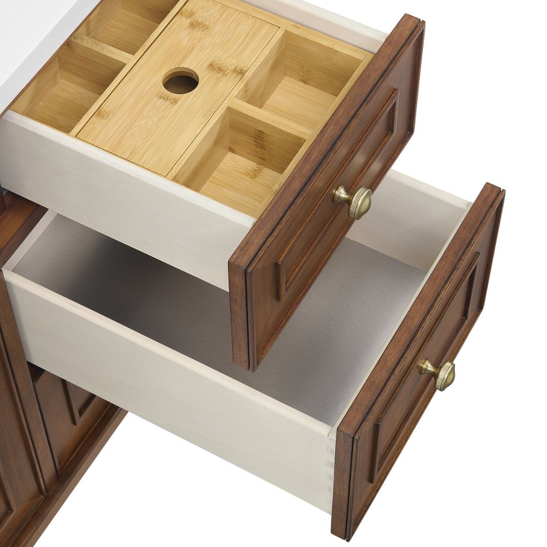 - Drawers lined with our signature brushed aluminum laminate for easy cleaning