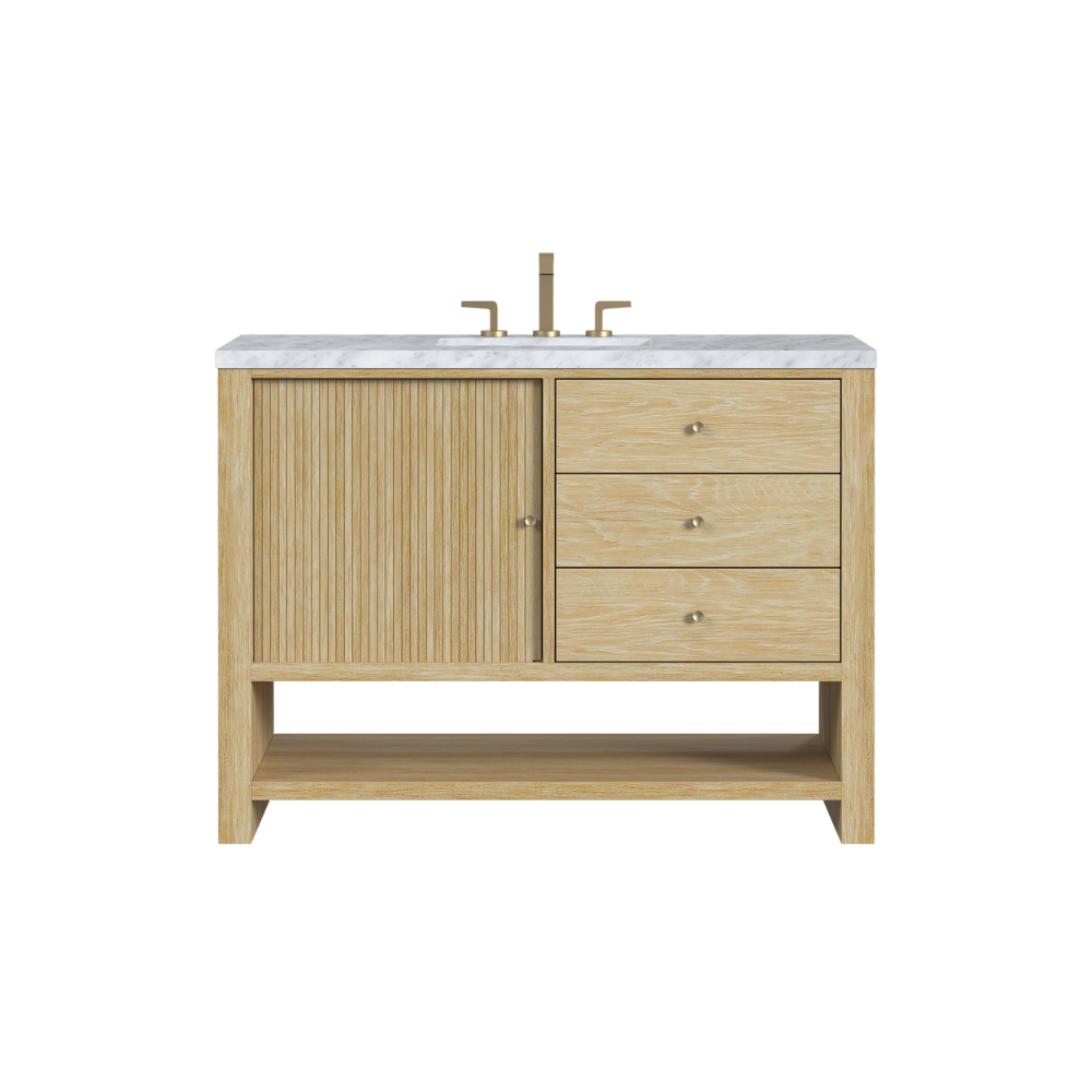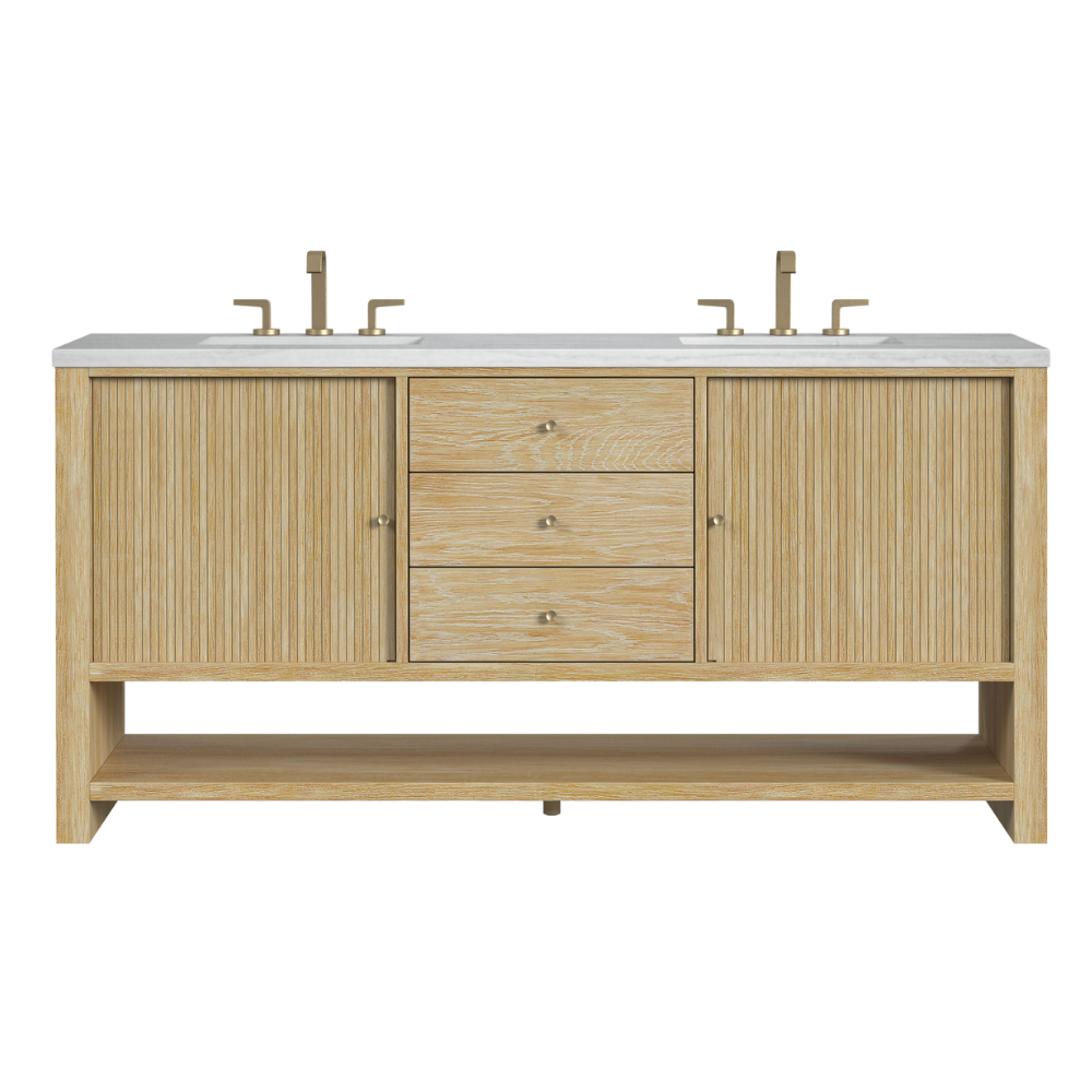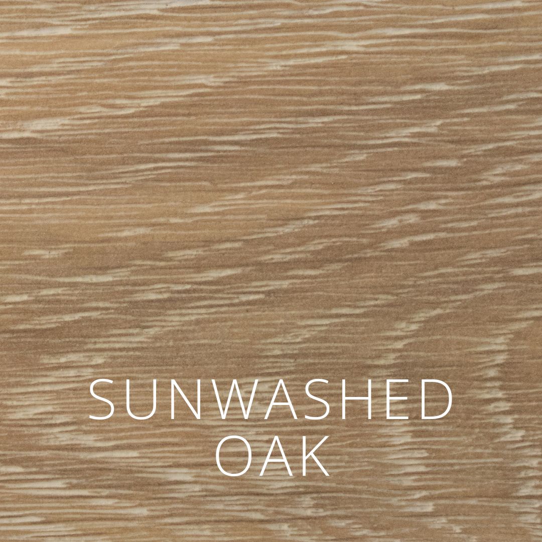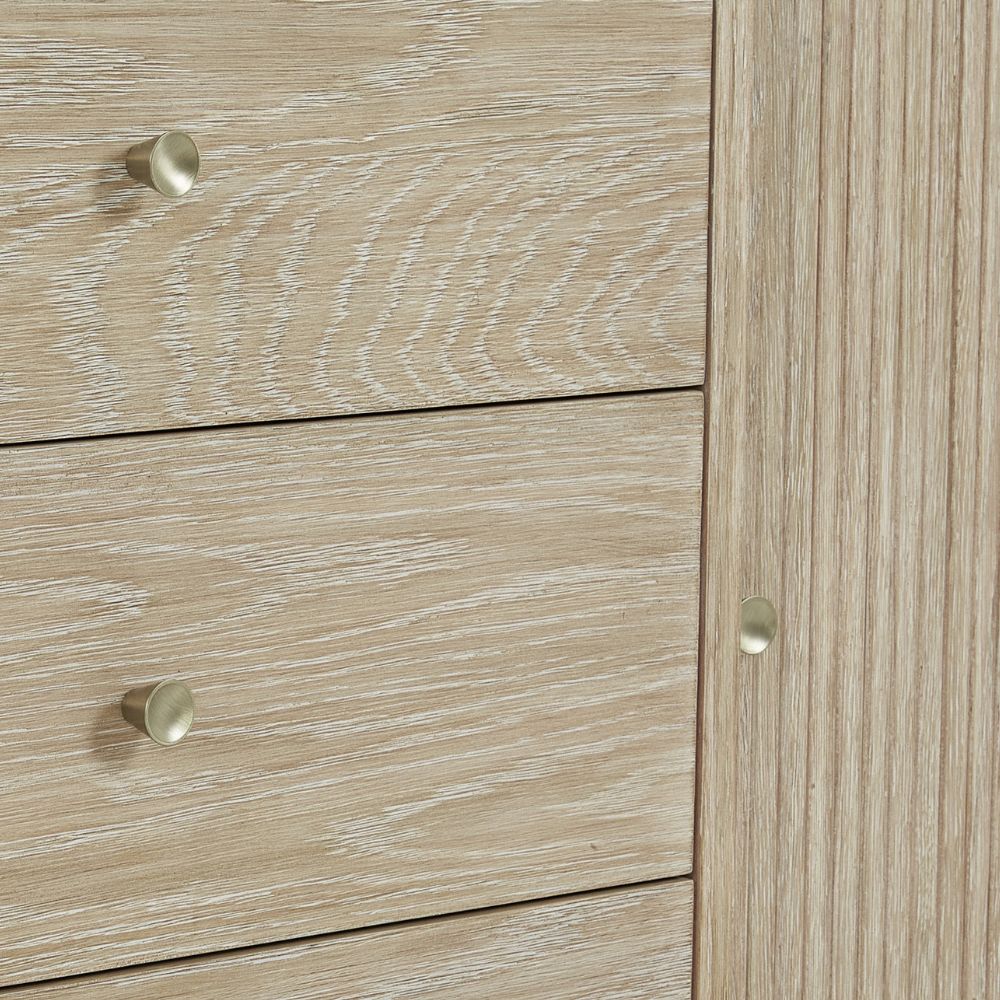 The understated waterfall frame, embellished with tambour doors, effortlessly blends contemporary design with practical modernity. The captivating warmth of the cerused Sunwashed Oak finish enhances the aesthetic appeal.